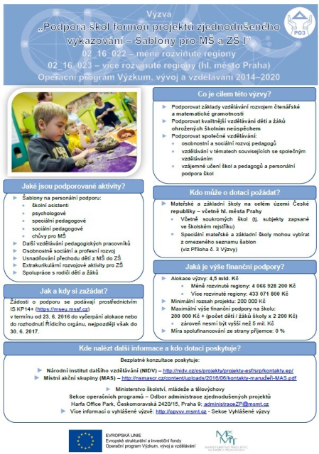 Cílem výzvy je podpořit mateřské a základní školy formou projektů zjednodušeného vykazování. Výzva podpoří osobnostně profesní rozvoj pedagogů prostřednictvím dalšího vzdělávání pedagogických pracovníků, vzájemného setkávání a sdílení zkušeností pedagogů a pomůže školám při společném vzdělávání dětí.Projekt ukončen v roce 2017.